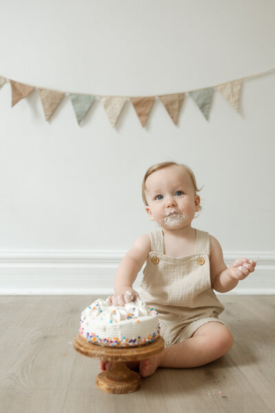 Let's celebrate your little one with portraits and a cake smash. Your session will include minimal props (balloons, garland, or a seamless backdrop). Cake is NOT included and will need to be brought into the studio by you. Child Only.